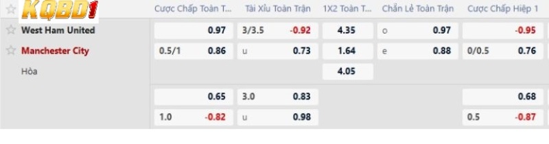 Biến động tỷ lệ kèo Châu Á West Ham vs Man City